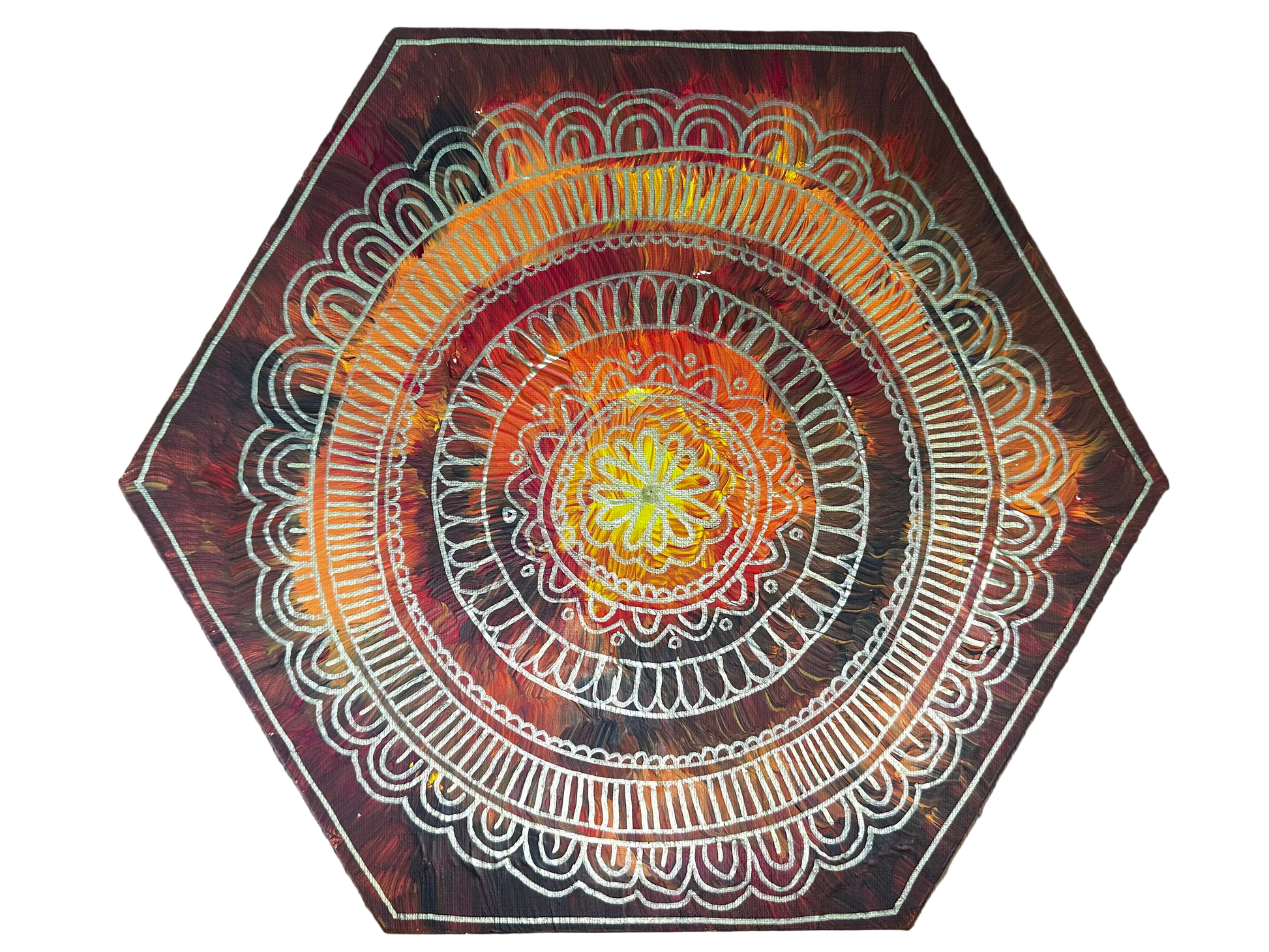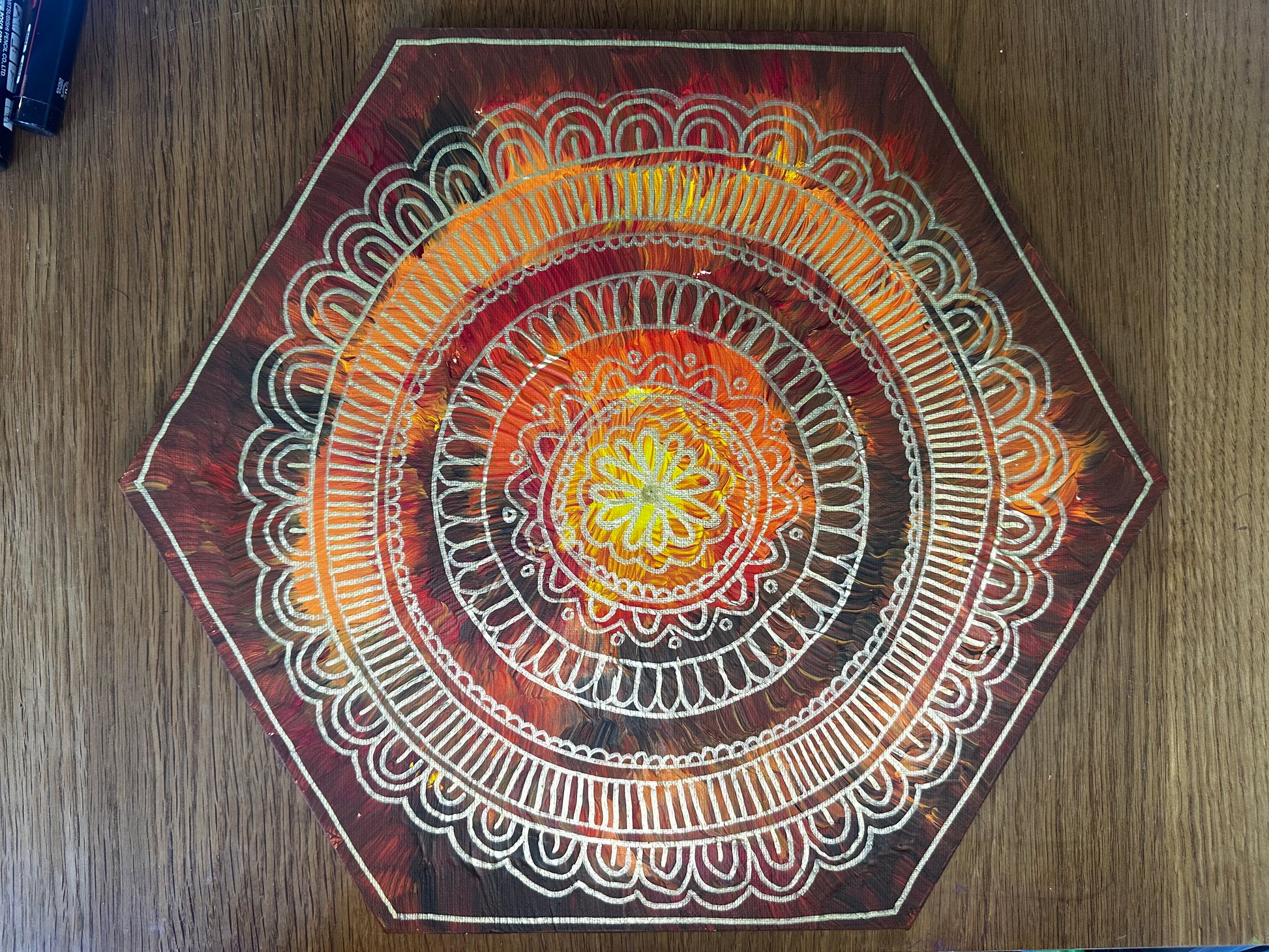 Acrylic painted hexagonal canvas with autumnal colours and gold mandala